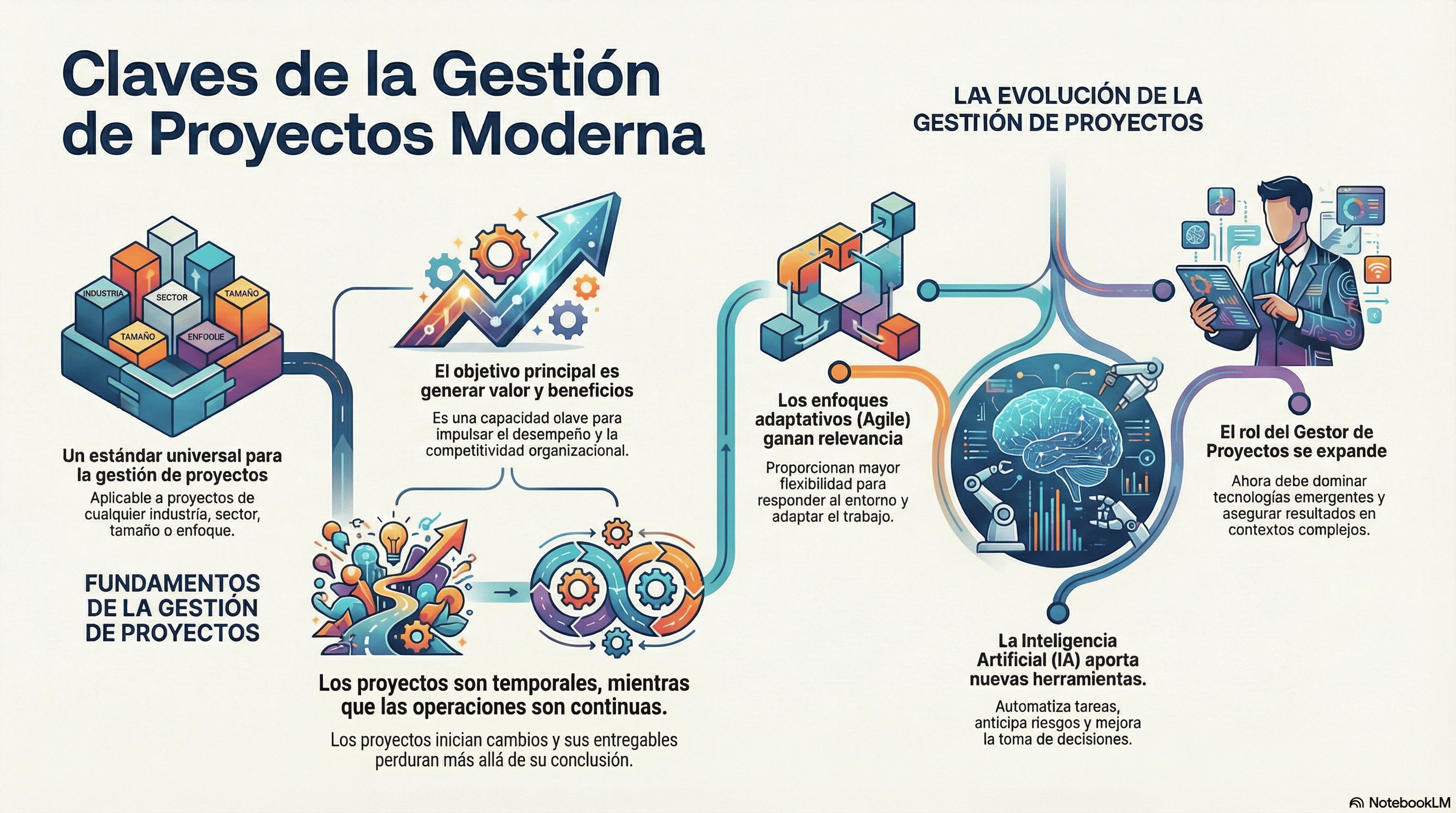 La presente unidad introduce los pilares de este nuevo enfoque, estructurándose en tres secciones clave. La primera define el Propósito del Estándar, contextualizando la evolución del director de proyectos hacia un perfil estratégico en la era de la IA generativa. La segunda sección establece los Términos y Conceptos Clave, necesarios para unificar el lenguaje entre portafolios y programas. Finalmente, se abordan los Elementos Fundamentales, detallando cómo interactúan la gobernanza, las operaciones y la estructura organizacional para transformar la estrategia en resultados tangibles.