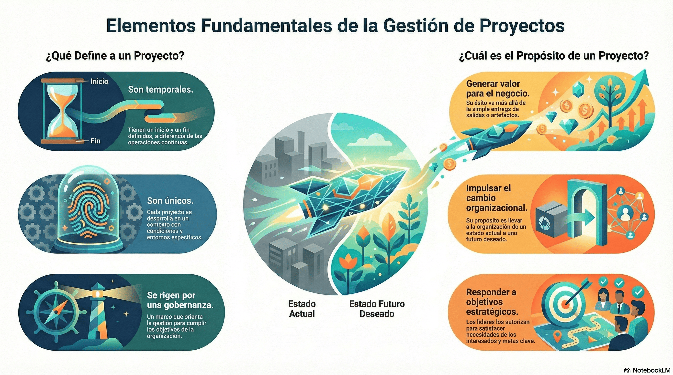 Los proyectos existen para generar valor, no únicamente para producir entregables. Son temporales, pues tienen inicio y cierre definidos, y se desarrollan en un contexto único influido por factores como alcance, duración, tecnología, ubicación, riesgos, costos y partes interesadas. Su propósito es producir un cambio organizacional que lleve de un estado actual a un estado futuro deseado.