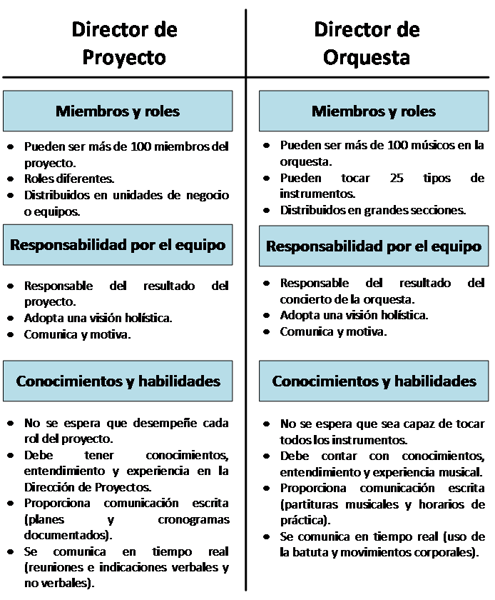 Una simple analogía puede ayudar a comprender los roles de un Director de Proyecto para un proyecto grande comparándolos con los roles de un director de una gran orquesta.