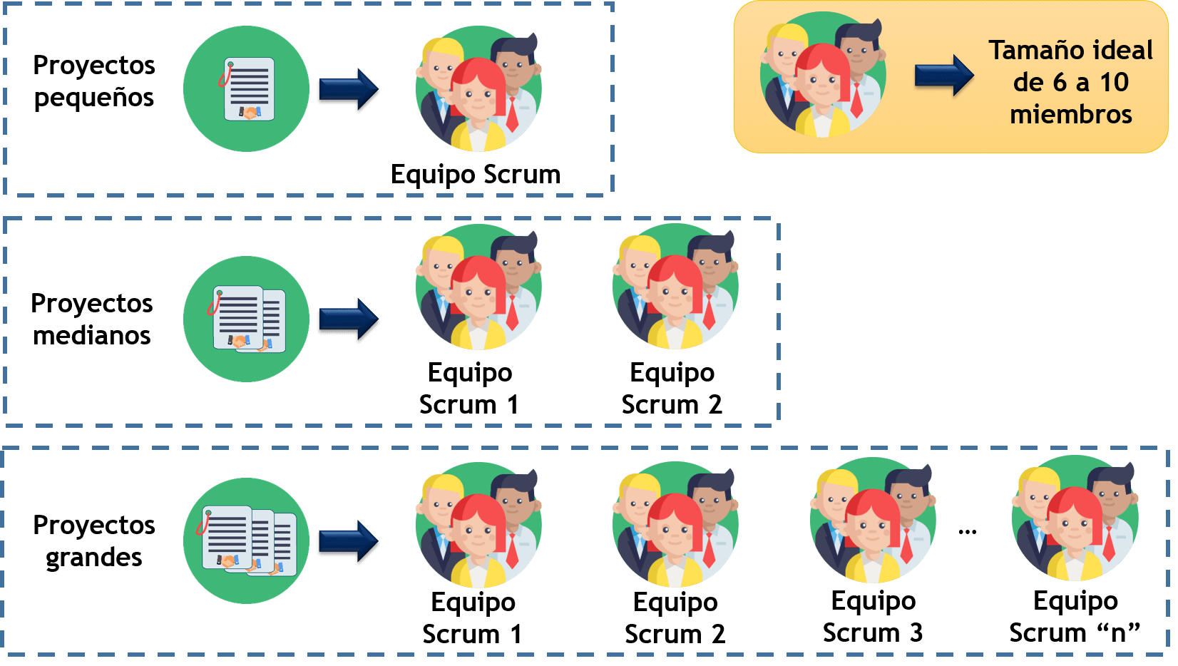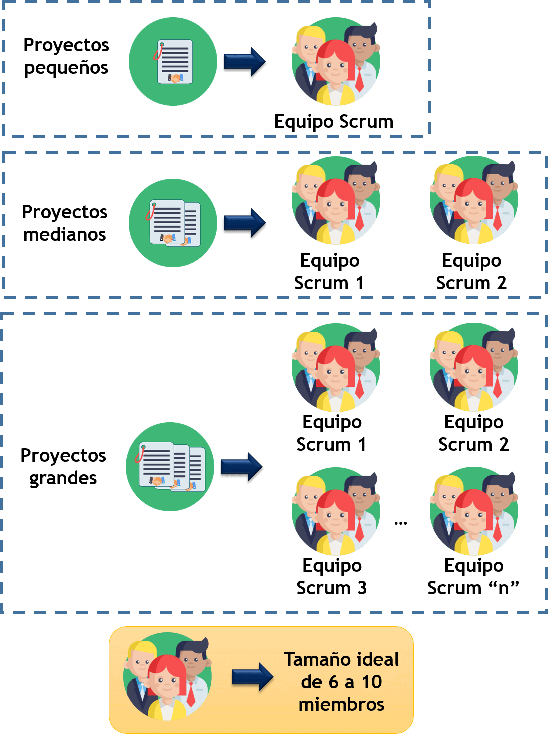 Para ser eficaces, los Equipos Scrum idealmente deben tener de seis a diez miembros. Esta práctica puede ser el origen de la idea errónea de que el framework de Scrum solo puede utilizarse para proyectos pequeños. Sin embargo, este framework puede escalarse fácilmente para ser utilizado de manera eficaz en grandes proyectos, programas y portafolios.