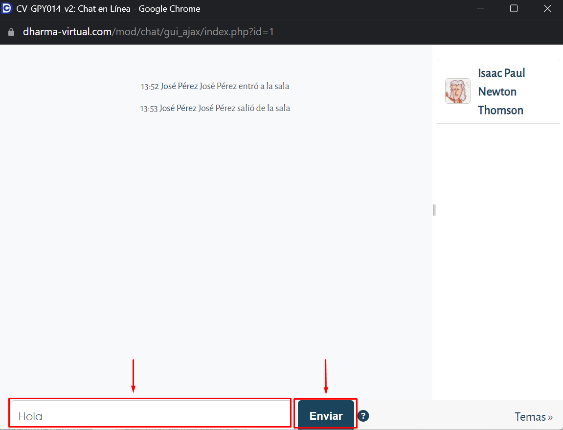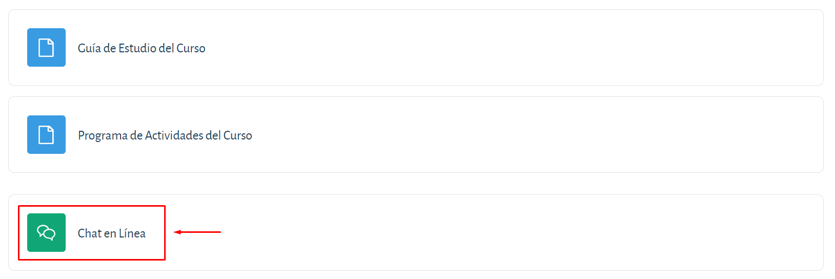 Ubíquese en el Bloque de Presentación y debajo de la Guía de Estudio y del Programa de Actividades encontrará el “Chat en Línea”.