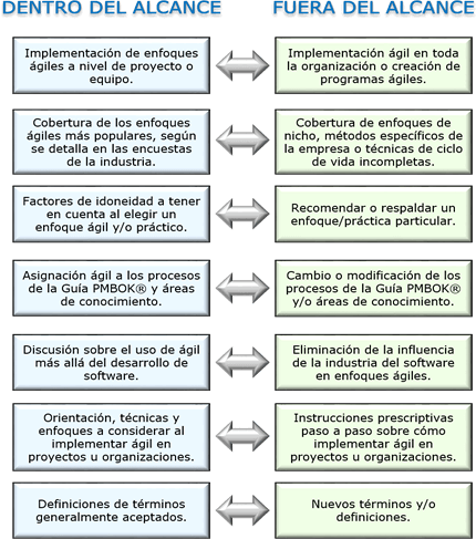 Los Fundamentos de Gestión Ágil de Proyectos están centrados en los proyectos y abordan la selección del Ciclo de Vida del Proyecto, la implementación de ágil y las consideraciones organizativas para proyectos ágiles. La Gestión de Cambios en la Organización (OCM, por sus siglas en inglés) es esencial para implementar o transformar prácticas, pero ya que OCM es una disciplina en sí misma está fuera del alcance de los Fundamentos de Gestión Ágil de Proyectos. (VER GRÁFICO)